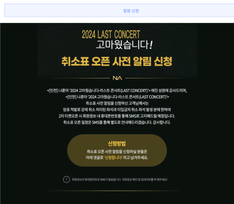 만약 티켓예매를 하지 못했다면 취소표에 도전해 볼 수 있습니다. 취소포 오픈사전 알림을 설정해 두고 댓글에 '신청합니다'라고 남겨놓습니다.