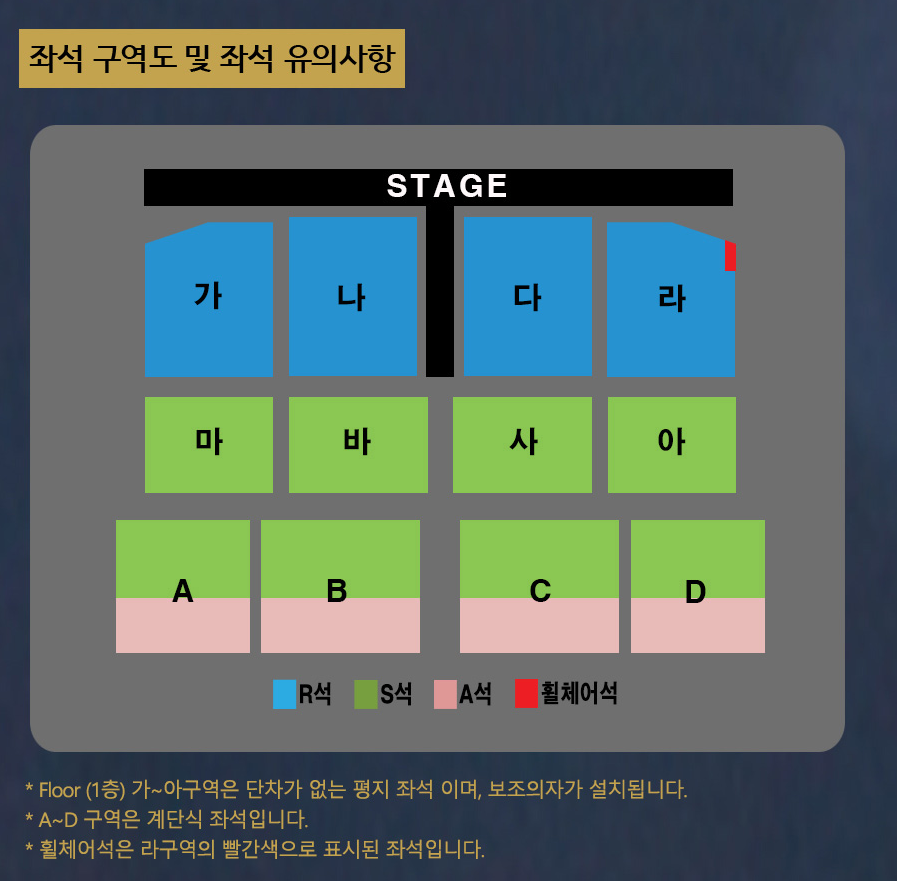 1층 가~아 구역은 평지좌석이며 보조의자가 설치되어 있습니다. A~D구역은 계단식 좌석입니다. 휠체어석은 라구역의 빨간색으로 표시된 좌석입니다. 휠체어석 문의는 (1544-6399)로 하시면 됩니다.